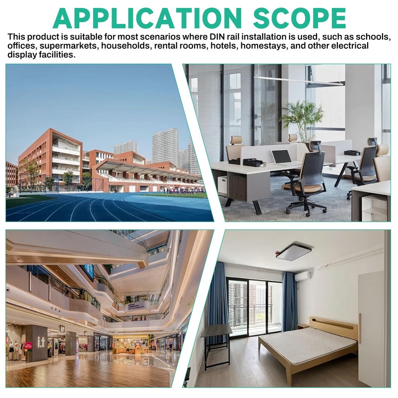 - Wide range of applications: the smart meter is suitable for most of the scenarios that use DIN rail mounting, such as schools, offices, supermarkets, household, rented apartments, hotels, guesthouses and other electrical display facilities.