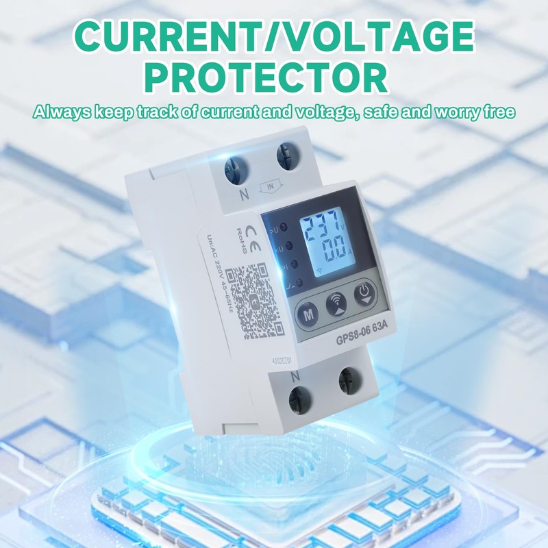 63A WiFi Switch with Surge Protection Overcurrent Smart Meter Switch 2P 230V AC Self-Resetting Function Over/Under Voltage and Over Current Can Be Adjusted (GPS8-06-U)
