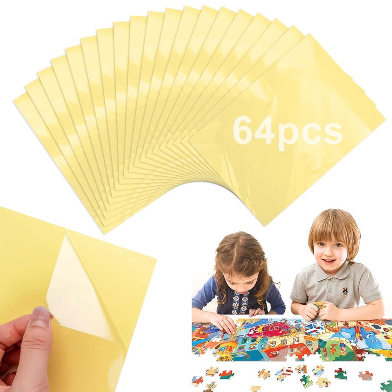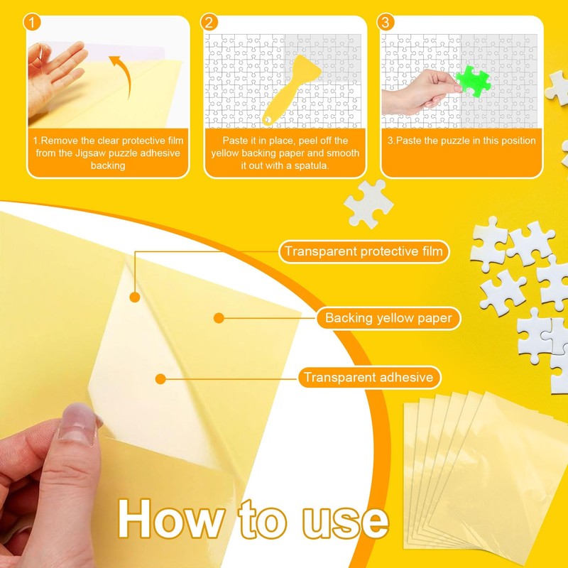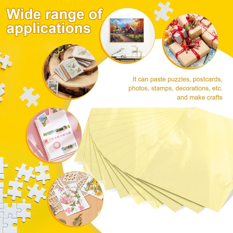 - Double-sided puzzle adhesive backing: you will receive 64 sheets of transparent self-adhesive film (25 x 18 cm), each sheet consists of three parts (yellow backing paper, transparent adhesive, transparent adhesive film), one pack is enough for 8000 puzzle pieces. Puzzle glue. It can be cut to the size and shape of the puzzle