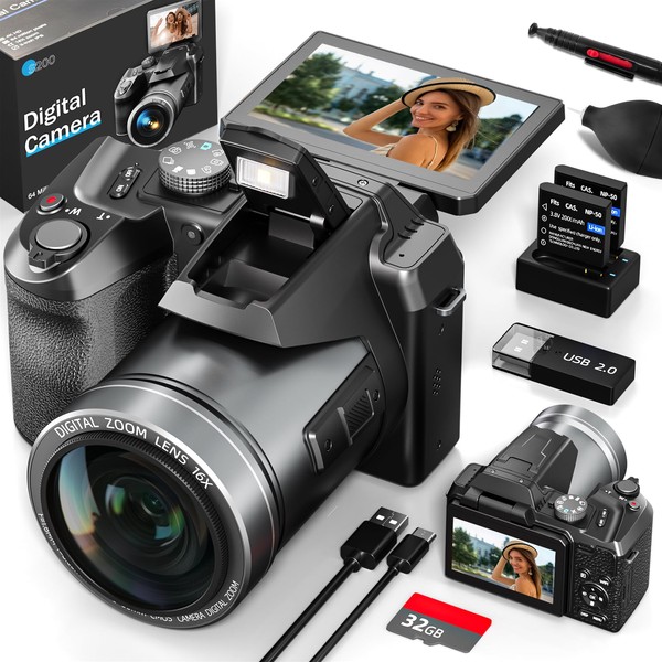 64MP Digital Camera for Photography Autofocus, 5K vlogging Camera for YouTube,16X Anti-Shake Compact Travel Camera with WiFi & App Control, Flash,SD Card, 2 Batteries S205