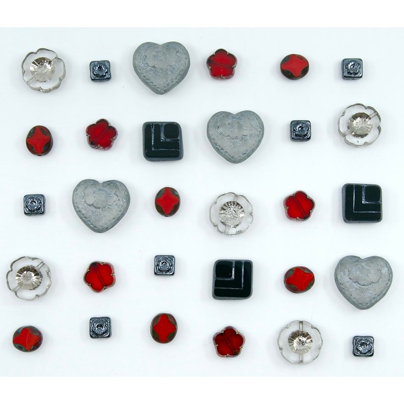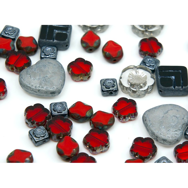 65+ pcs (2.1oz=60g) of Focal Glass Bead Mix with Table-Cut Hawaii Flower and Heart with Rose Beads, PG Gray Red