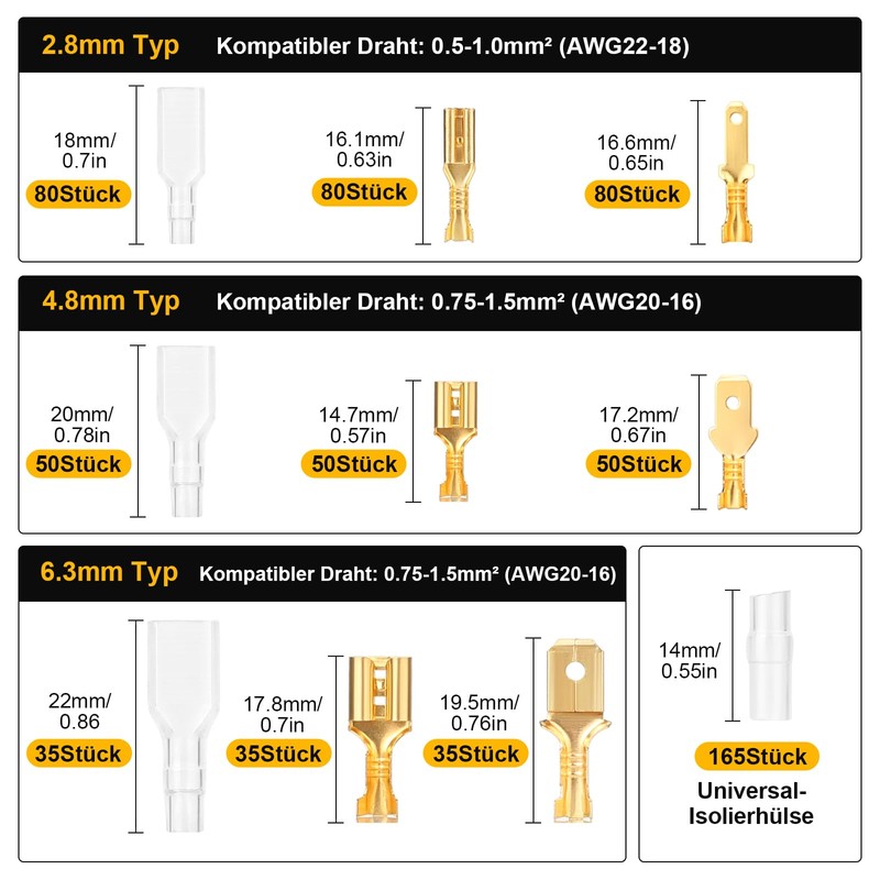 - 3 different models: our cable lugs flat connector sets are available in three common sizes, type 6.3 (for thicker wires, typically about 0.75-1.5 mm² or AWG20-16), type 4.8 (for medium wires, typically about 0.75-1.5 mm² or AWG20-16) and type 2.8 (for thin. Typ. approximately 0.5-1.0 mm² or AWG22-18), which makes it adapt to a wide range of wire thicknesses