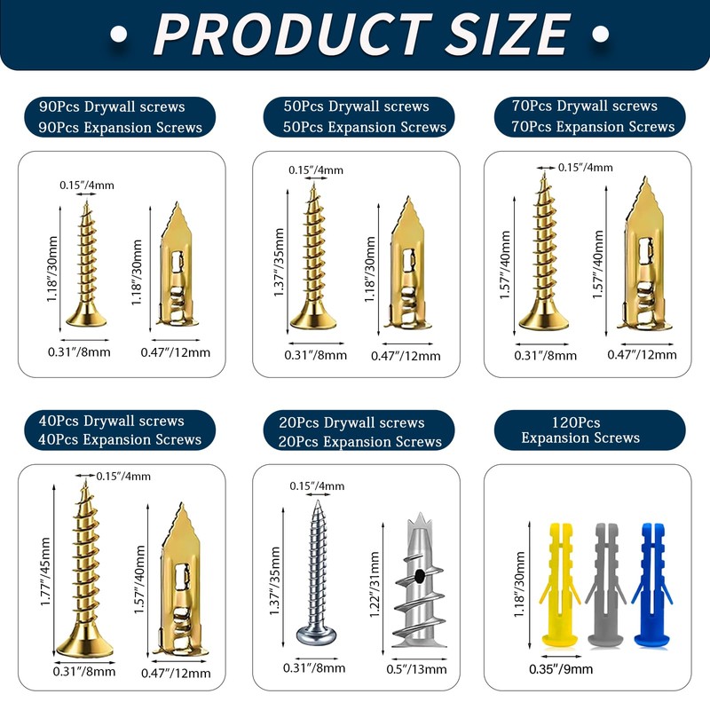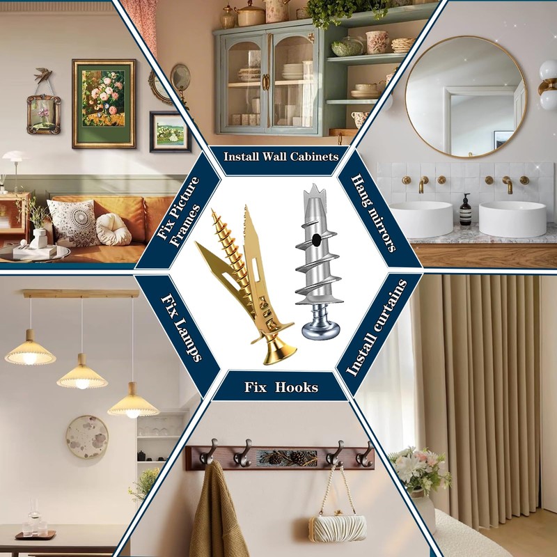 - Easy to Use: These self drilling drywall anchors are easy to install without pre-drilling. Golden self drilling drywall anchors simply tap the anchor nail into the wall, secure your item, then tighten the screw for a firm hold. Silver self drilling drywall anchors just screw directly into drywall using a standard screwdriver or drill—no extra tools required.. These drywall anchors and screws kit reduce wall damage and ensure a secure fit without damaging the wall surface.