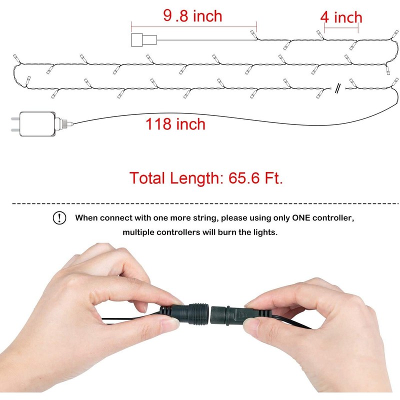 **Our Christmas string lights, excellent decoration for Christmas trees, garlands, bedroom ceiling, etc.** **Specifications:** Bulb type: Led Lighted length: 66 Feet. Led bulb quantity: 200 pcs Bulb spacing: 4 inches Lead cord: 9.8 Feet. Max connectable strands: up to 3 strands together Light color: Warm white Waterproof grade: IP44 Power input: 120V