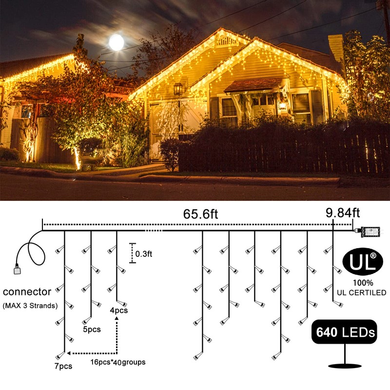 • [LED Icicle Christmas Lights] 640 LED Christmas lights totally length is 76ft, including 66ft icicle lights and 10ft extension cord. The icicle Christmas lights can be connected up to 2 sets to decorate larger areas, suitable for use throughout the year - birthdays, anniversaries, Christmas decoration. The connectable icicle lights can be controlled by one button on the power adapter. Hang these string lights outdoor indoor to create warm and romantic atmosphere for you.