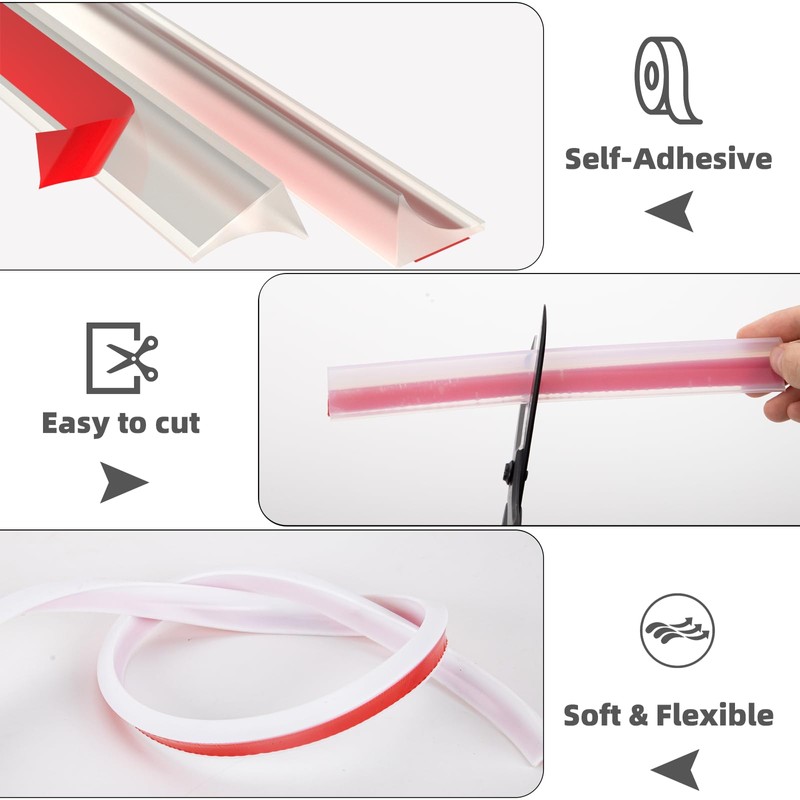 - 【Easy to Install】 : Clean and dry the surface,cut to the length you need,peel the self-adhesive strip on the bottom, press to the surface,💡 the edges of the water retaining strip must be sealed with silicone sealant(For better stickiness, heat up the tape with hair dryer)