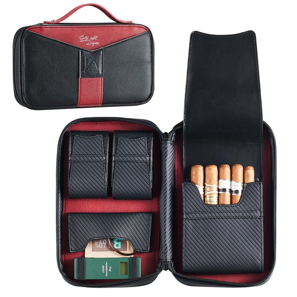 68 Degrees Leather Cigar Case for 5 Cigars – Red Travel Humidor with 3 Accessory Pockets, Full Grain Hard Shell Organizer, YKK Zipper, Cigar Pouch for Men