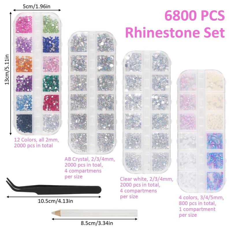 - 6800 pieces rhinestones: This glitter stone nail set contains 1 box of 2000 pieces phantom colour rhinestones, 1 box of 2000 pieces white rhinestones, 1 box of 2000 pieces coloured rhinestones, 1 box of 800 pieces coloured semi-circular pearl nails rhinestones, 1 tweezers and 1 wax pen, enough to complete a complete craft project. .