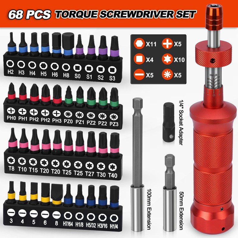 68Pcs Torque Screwdriver Wrench Set 10-70 IN.LB, Inch Pound Torque Driver with S2 Steel Bits, 1/4" Drive, Magnetic Quick-Release Adapter for Bike Repair, Mounting and Maintenance