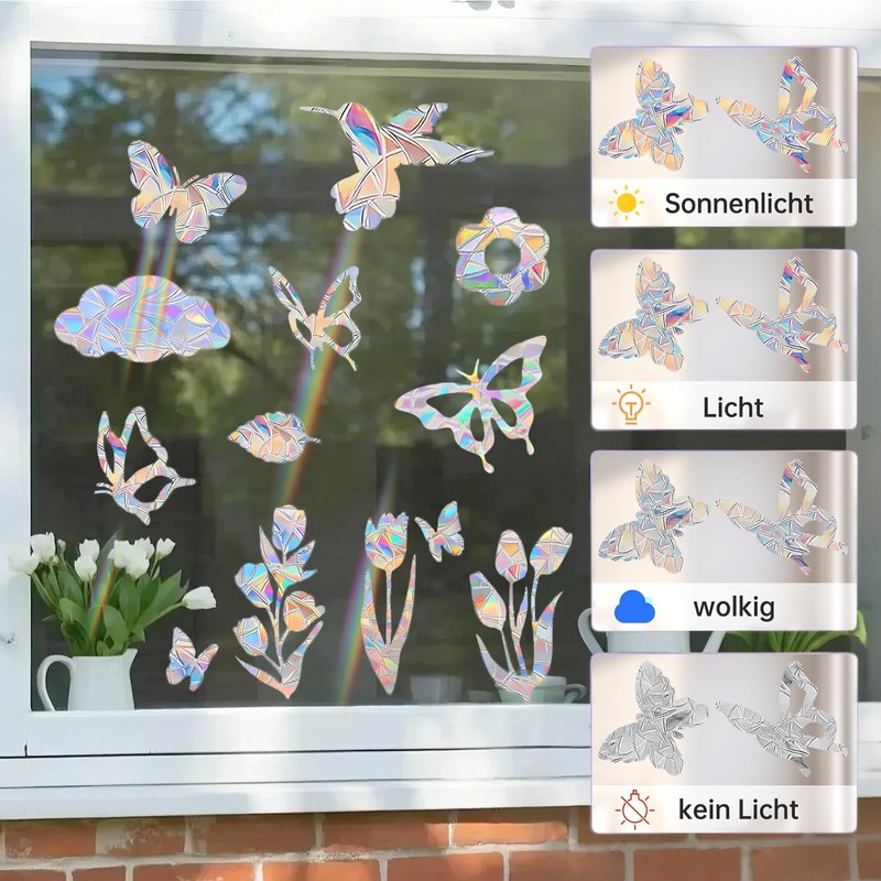 - Birds saving: Our bird protection sticker for windows is designed with a reflective material on the surface, sun catcher for window sticker reflects UV rays, rainbow sticker window helps birds see the clear glass and reduces the number of birds colliding with the glass. You can also stick the rainbow window stickers bird protection on glass doors to remind people and pets not to collide with them.