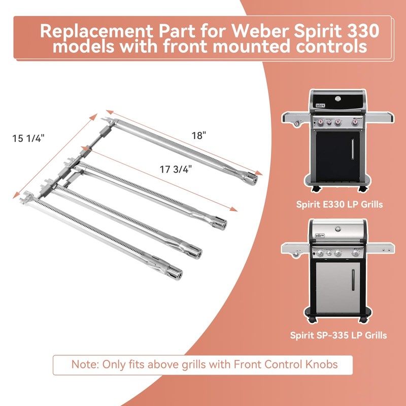 - 【Custom for Spirit 330/335 series】Grill Burner Tube kit fits for Weber 68948, Weber Spirit 335 LP grill models, Replace for 46802101; Weber Spirit 330 gas models with front mounted controls, built in 2015. ORIGINAL PART NUMBER : Weber 65518. 【ALSO COMPATIBILITY】Grill Burner for Weber Spirit 300 and GS4 Spirit ii 300 Series, Spirit E/S 310, 320 & 330 (2013-2017) with front mounted control knobs. Detail models are: E-310, S-310, E-320, S-320, E-330, S-330, SP-330, Spirit II E-310/320, Spirit II S-310/320 models