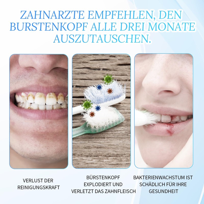 - ZAHNSCHUTZ:95%-98% Spitze der Borste vor dem Verpacken gerundet. Erwägen Sie nur, Ihre Zähne beim Zähneputzen in hoher Vibration zu schützen. Der Zahnschmelz würde abgenutzt werden, wenn die Borsten nicht abgerundet waren.