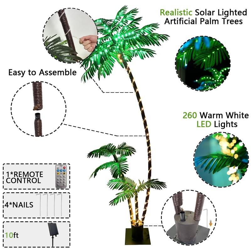 SOSHOT 6FT Solar Lighted Palm Trees for Outside Patio Light Up 260 LED Artificial Fake Tree Lights for Pool Bar Tropical Party Deck Outdoor Decorations