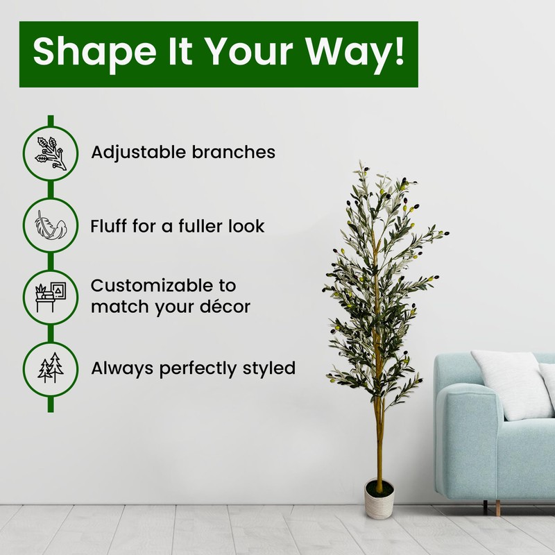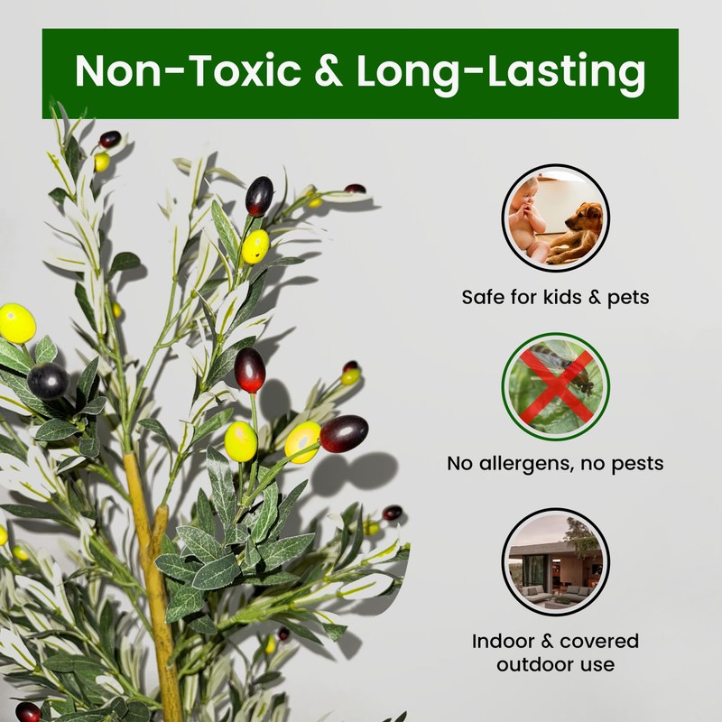 • 🌿 Ultra-Realistic Design – Featuring a natural wood trunk, lifelike silk leaves, and delicate artificial olives, this 6ft faux tree perfectly replicates the beauty of a real olive tree.