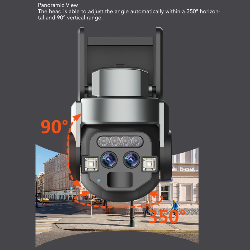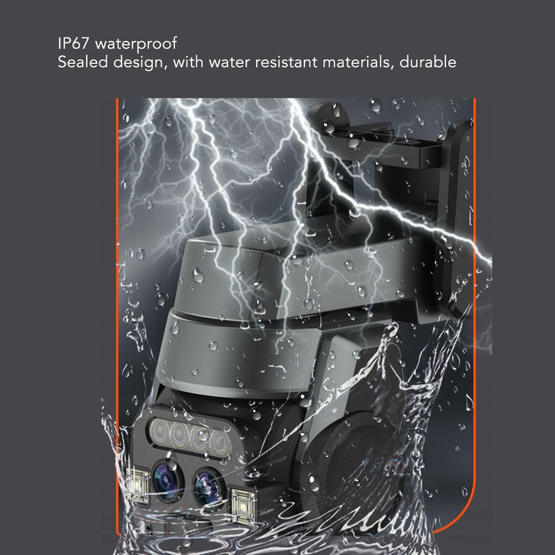 1、Intelligent Dual Lens: Equipped with two high definition lens which can take 1080P level videos, it supports features like autofocus, automatic light adjustment, and motion detection for clear and vivid images. 2、Broad Heading: The dual camera system captures an extensive shooting angle that satisfies the demands of an entire yard. Every object in the vicinity is visible in the frame, leaving no place undisclosed. 3、AI Human Detection: When a human movement is detected, the camera automatically tracks the action. The camera automatically adjusts within a horizontal 350° and 90° pitch range to keep the subject center in the frame at all times. 4、WiFi Connectivity: Once connected to a smartphone, it displays the camera feed and sends alerts to the phone when a person is detected. It also supports sharing the video feed with multiple viewers. 5、IP67 Waterproof: It features a sealed design and water resistant materials, enduring wind, sunlight, snow, rain and more. It's durable, waterproof, dust proof, frost proof, and sun proof. 6、Night Vision: The camera supports intelligent black and white, full color night vision, automatically adjusting according to the current lighting. Accompanied by 10X zoom technology and high brightness supplement light, it allows you to clearly see objects even in the darkness.