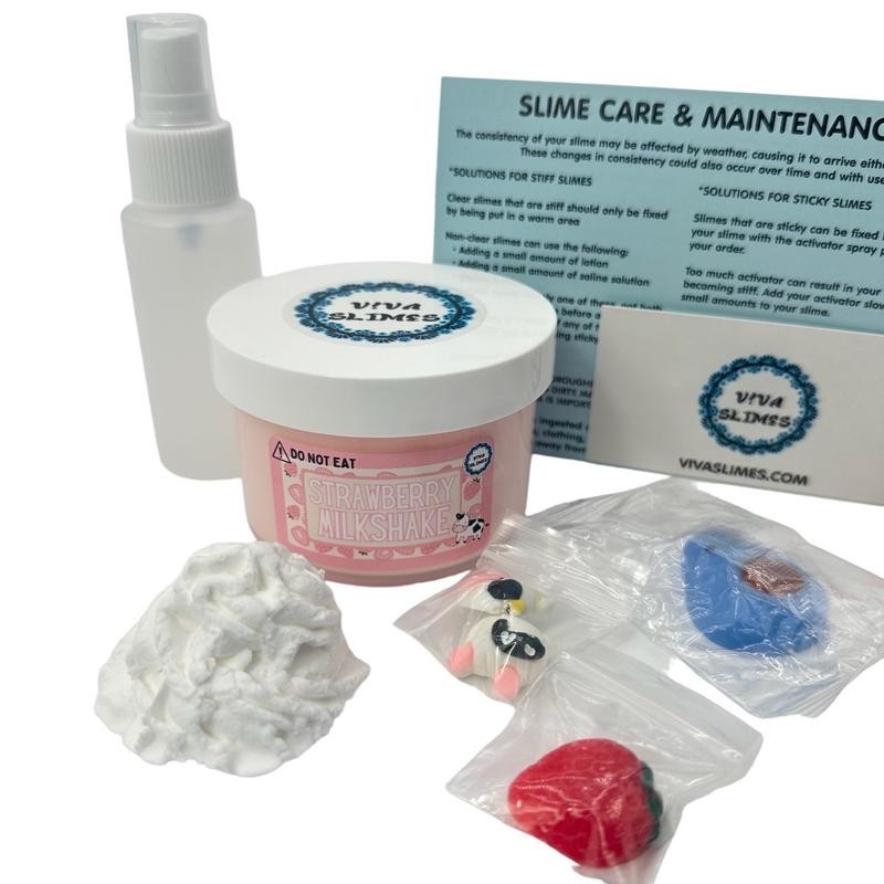 - 6oz pink slime - whipped cream clay piece - 1 strawberry charm and 2 cow charms - 2 fl. oz activator spray bottle - Business card - Slime care card