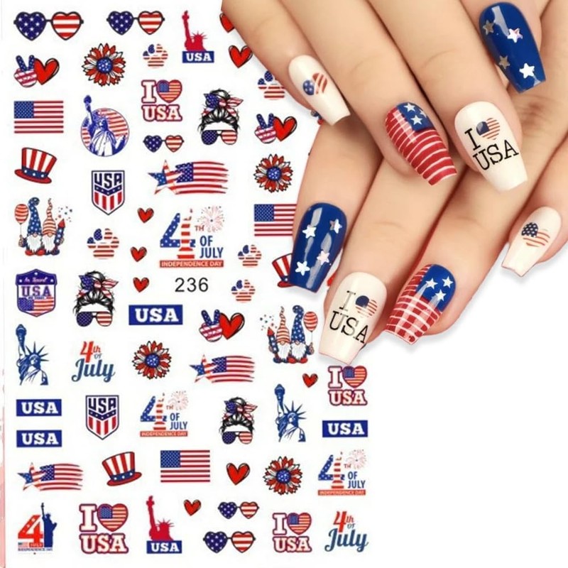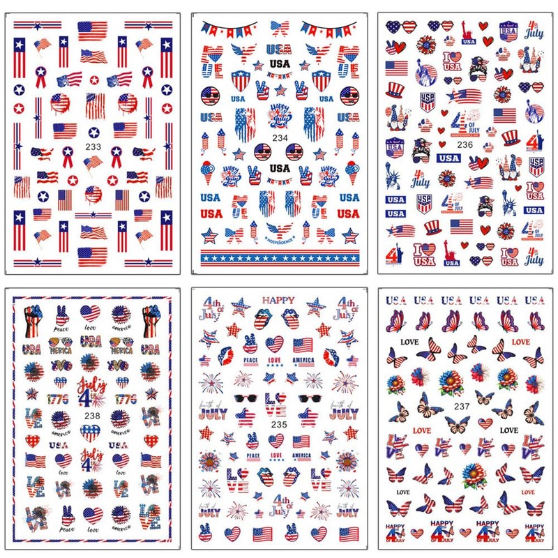 - 【Package】You will get 6 sheets USA patriotic theme nail decals, 3d interesting patterns for you to use and replace at 4th of July parties or in daily life, nail decals are full of fun and patriotic, various unique patterns bring you a different mood.
