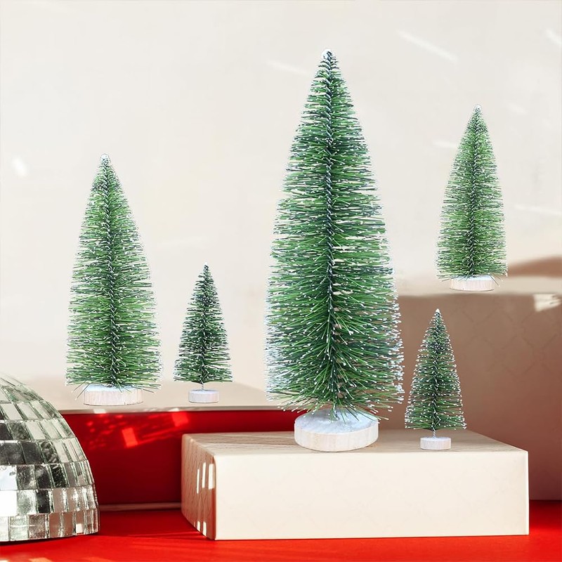 6PCS Artificial Mini Christmas Trees, Bottle Brush Christmas Trees with Wood Base, Artificial Snow Frost Trees Sisal Trees for Christmas Decoration, Green 13cm