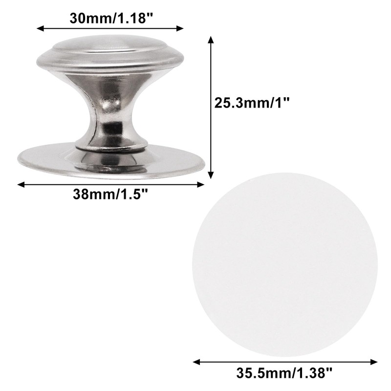 - Suitable Size: The stick on cabinet knobs are small mushroom style. Top diameter is 30mm/1.18"; Base diameter: 38mm/1.5"; Height: 25.3mm/1"; Adhesive pad diameter 35.5mm/1.38"