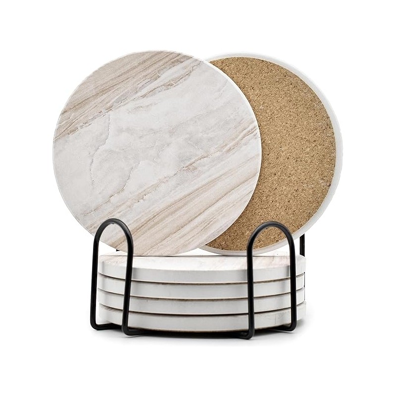 6Pcs Drink Coasters with Holder, Marble Style Ceramic Drink Coaster, Absorbent Coasters Set Suitable for Kinds of Cups, Modern Style Coasters for Coffee Table, 4 Inches