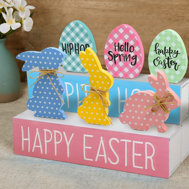 - 【Great Value】 Lulupia Easter tiered tray decor consist of 3pcs spotted bunny and 3pcs egg cut-out wood blocks, each Easter bunny decor with a jute ribbon bow rope tied by the neck. Comes in 6 different pretty pastel colors and styles, those rabbits seem more motivated to jump around and easy to get in the Easter spirit and add a festive touch to your home. Very cute addition to your Easter decor