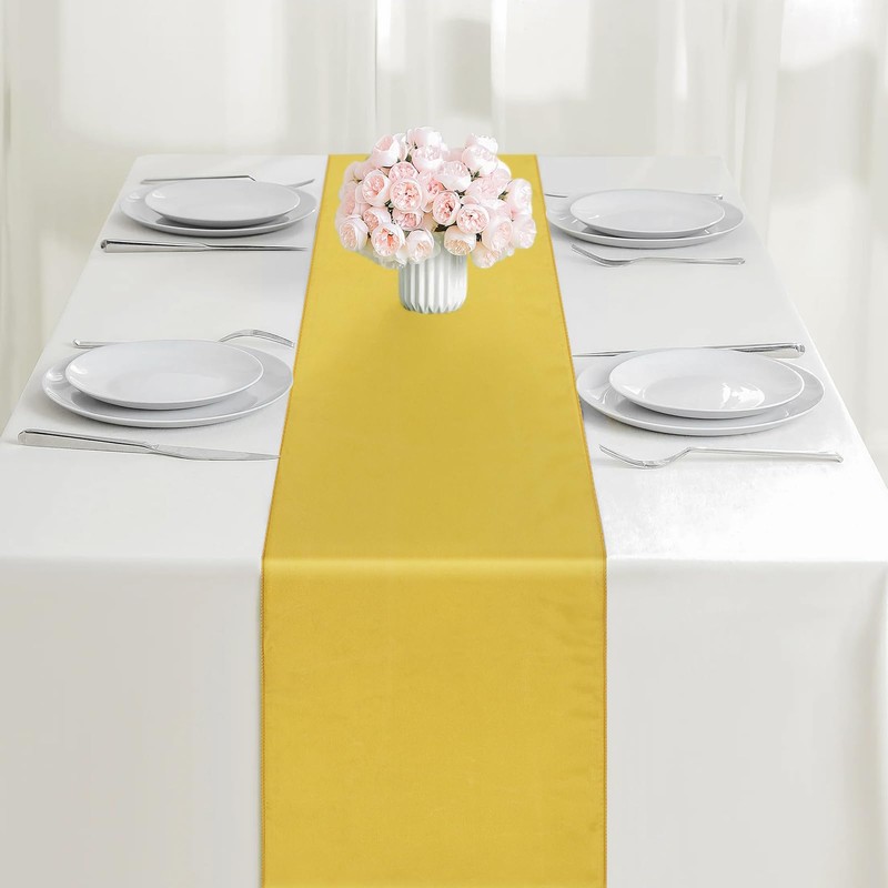 - Light Gold Table Runner: Gold satin table runners are made of soft fabric, which has a smooth surface and a great drapey, can be reused. A perfect addition to your dining table decor.