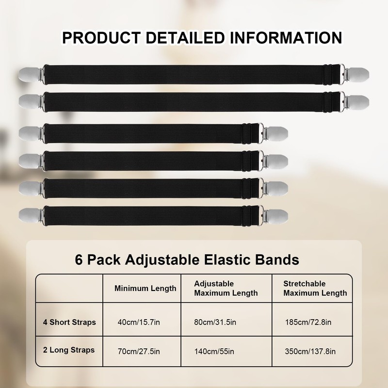 • Product Size: These bed sheet corner fasteners have good elasticity, the short stretchable adjustment range is 40-185cm/15.7-72.8 inch, and the long stretchable adjustment range is 70-350cm/27.5-137.8 inch.