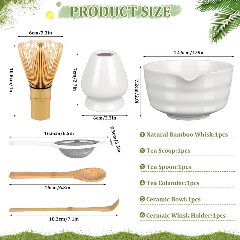 - đ”ăComplete Matcha Tea Set for Traditional CeremoniesăJapanese Matcha Kit includes all you need to prepare a good quality matcha and meditative tea experience. 6 pcs / Matcha whisk set includes: 1* Natural Bamboo Whisk, 1* Matcha Spoon, 1*Attractive Ceramic Bowl(450 ml/15.84 oz), 1* Cermaic Whisk Holder, 1* Bamboo Matcha Scoop, 1* Matcha Powder Sifter. This Bamboo Matcha Traditional Starter Set has elevated tea ceremonies to a whole new level of authenticity and enjoyment.