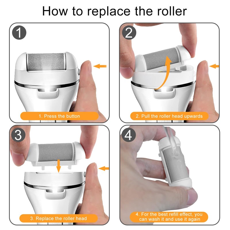 - Product Function: Extra coarse roller head is suitable for very serious dead skin, regular coarse roller head is for newly formed dead skin on the feet, and fine coarse is used for daily foot care. You can choose one of the roller heads according to your needs.