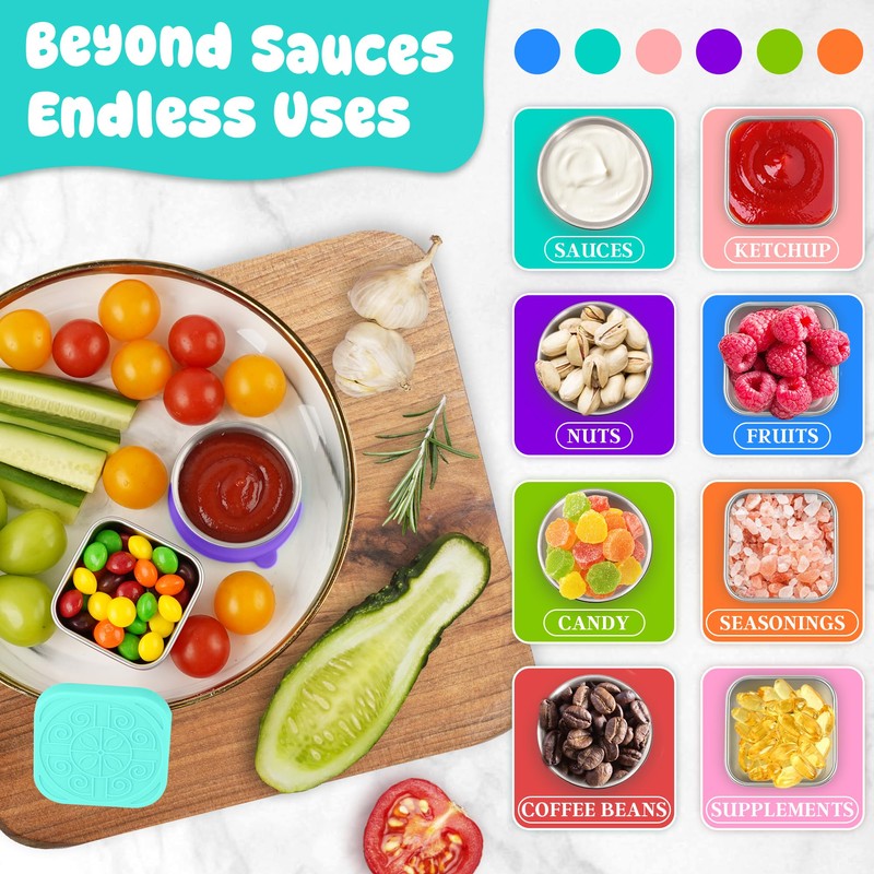 - 【EASY OPEN LEAKPROOF LIDS】: The soft silicone lid of the sauce cups is very easy to put on and take off. The grooves fit snugly around the rim of the cup, making this salad dressing container completely leak-proof, say goodbye to sauce spilling! Different lid colors allow you to easily identify contents, making your meal prep and kitchen storage more convenient