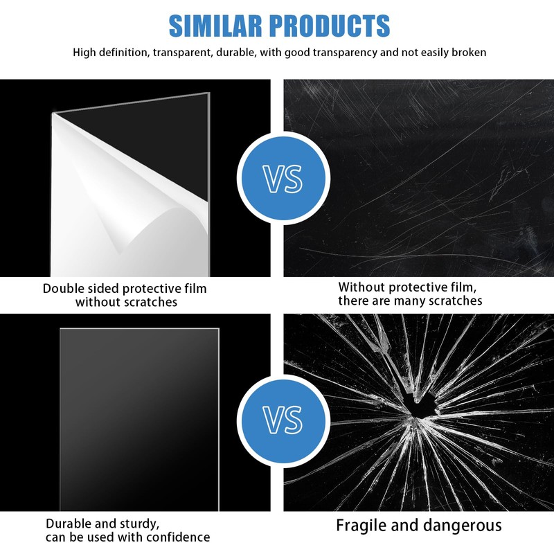 - 【High-quality Materials】- Compared with glass, our sheet is made of premium Acrylic,has the same transparency, lighter, stronger, resistant to abrasion, and usually does not crack or shatter. With a certain degree of thermoplasticity, it can be processed and bent into other shapes, and it has more possibilities for DIY projects.