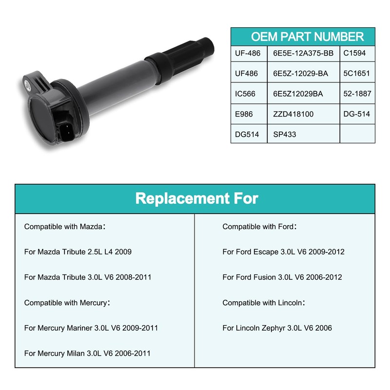 6PCS UF486 Ignition Coil Pack (3.0L V6 Only) For Ford Escape 2009-2012,Fusion 2006-2012,Lincoln Zephyr 2006,Mazda Tribute 2008-2011,Mercury Mariner 2009-2011,Milan 2006-2011 IGC0158 5C1651