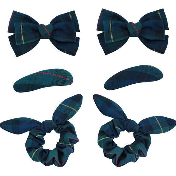 6pcs Uniform Hair Accessories for Girls, 2 Back to School Bows Clip 2 Plaid Bunny Ear Bowknot Scrunchies 2 Snap Barrettes Long Tail Hair Bow Set for Toddler Little Girl (Dark Green, Navy, Yellow, Red)