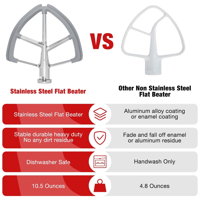 • [FEATURE]: Flex Edge Beater Is Made Of Stainless steel Metal Construction And Flexible Silicone Edges For Heavy Duty And High Durability. This Beater Blade Can Continuously Beats, Scrapes And Mixes Ingredient Side And Bottom Ensure Mixing Is Done Thoroughly Without Scratching Your Mixing Bowl And Cuts Mixing Time By As Much As 50%.No Need For An Extra Tool, The Flat Beater Can Also Double As a Spatula.