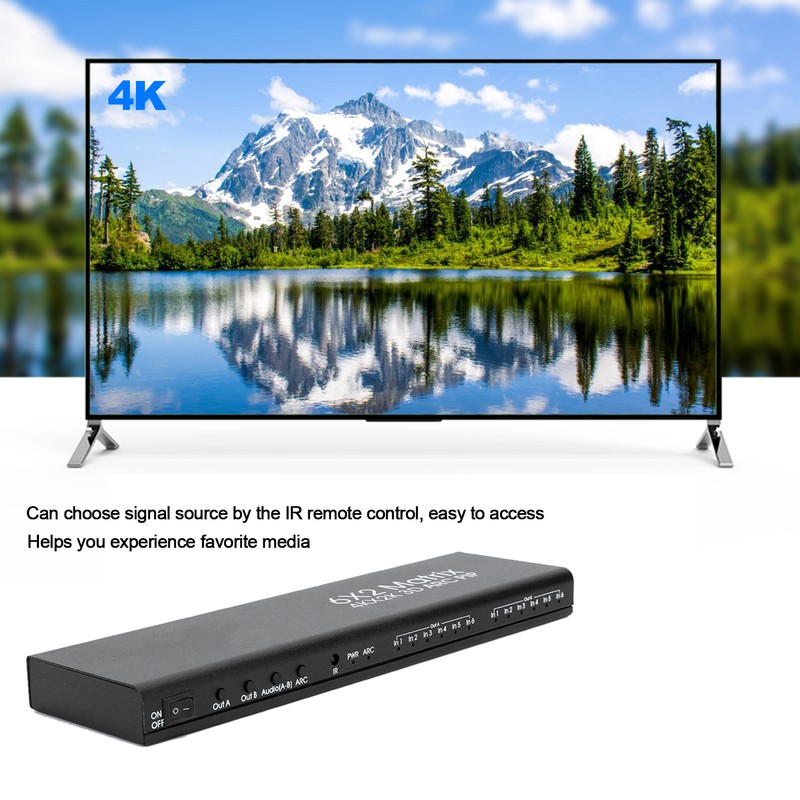 1、HDMI switch 6 in 2 out, this HDMI switcher designed with six inputs and two outputs, allows splitting videos to two HDMI displays simultaneously, can choose HDMI signal source by the IR remote control, easy to access. 2、4K HDMI switch, HDMI V1.4 helps experience favorite media through advanced crisp 4K at 30hz resolution and immersive 3D content(supports 1080p as well). 3、ARC function, this switch supports ARC(audio return channel), extractor audio from TV to soundbar or amplifier. Connect your TV HDMI(ARC) port to this switch HDMI "OUT A" port with HDMI cable, then connect optical cable to the soundbar, speaker, home theater, A/V receivers, etc. Just the "OUT A" port supports ARC function, support for Dolby Digital (AC3)/DTS/LPCM2.0 audio format. 4、Picture in picture, will show 5 sub‑screen and 1 main‑screen displays for PIP feature, allows you to preview devices simultaneously and switch between signals by pressing the button or remote control effortlessly. 5、Flexible control and no auto‑switch, plug and play, no auto‑switch. Built‑in IR sensor, comes with handy, intuitive remote that makes switching inputs, outputs, and audio channels. Slim, modern designed without the bulk to reduce footprint and blend in with surroundings.