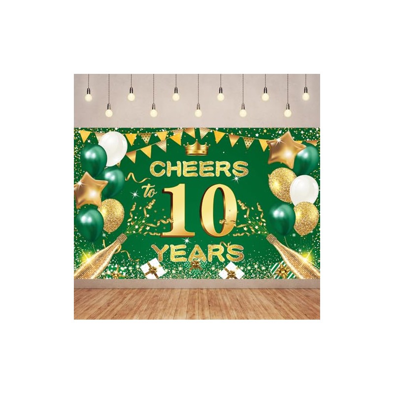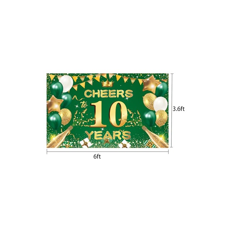 6X3.6FT Green Gold Cheers 10TH Years Banner Backdrop, Green Gold Happy 10th Birthday Decorations for Women Men Her Him Anniversary Photography Party Supplies. (G-Cheers10)