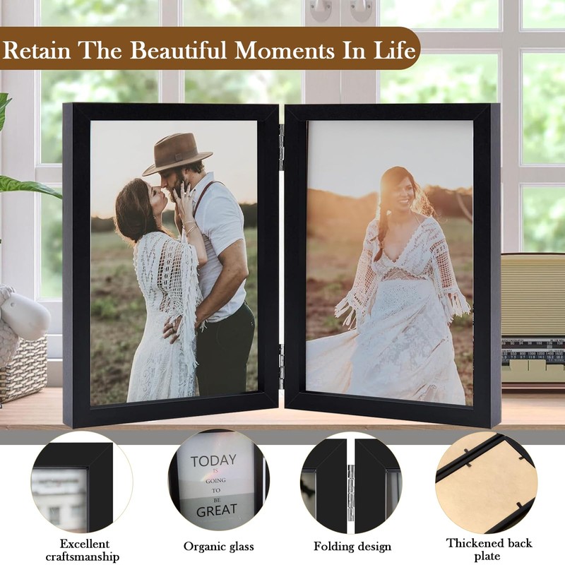 6x4 Inch Hinged Folding Picture Frame - Double Wooden Photo Frame with Glass Front, Tabletop Display, Desktop Stand Front Stand Vertical on Desktop Black(Black)