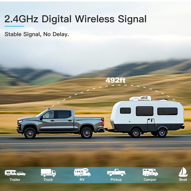 - Stronger Signal with Integrated Antenna: The unique spherical antenna integrated into the monitor’s top delivers superior signal reception compared to separate antennas. The 2.4GHz digital wireless signal reaches up to 150ft while driving and up to 492ft in open spaces when stationary, ensuring smooth video transmission even at high speeds.