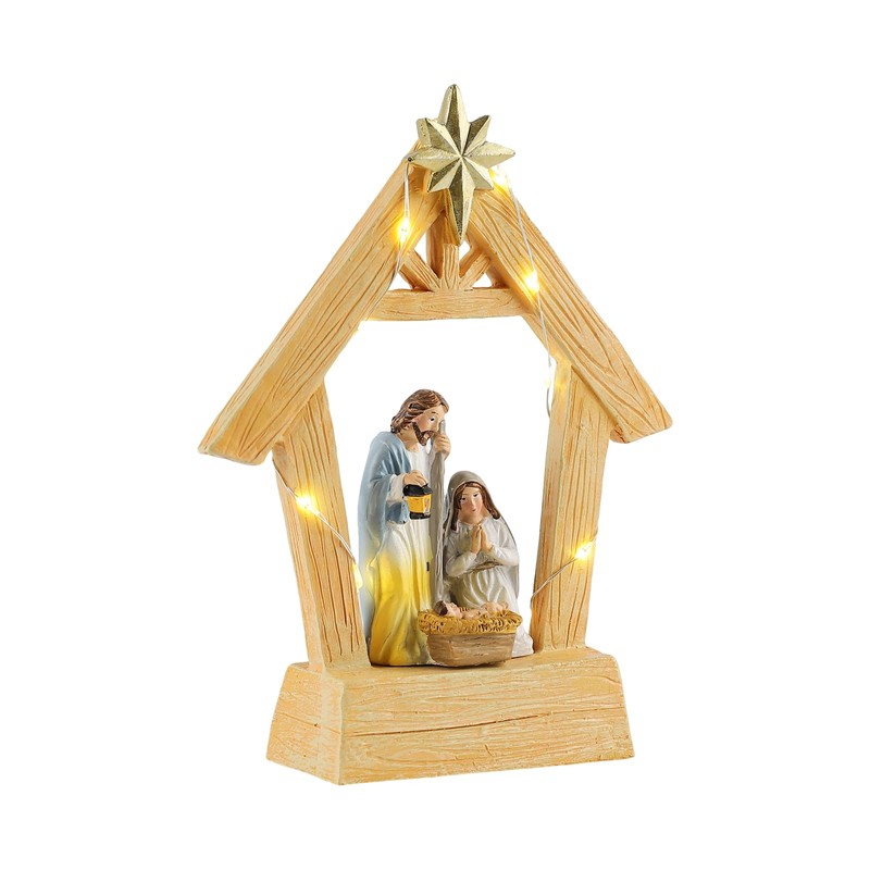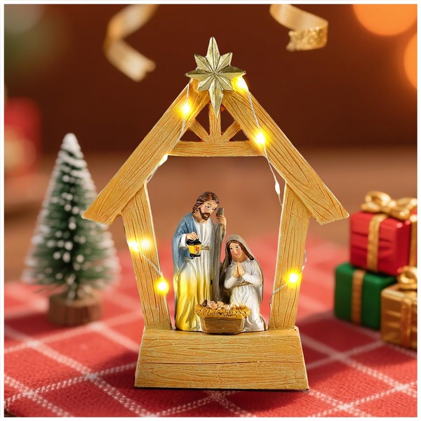 7.5" Nativity Scene with Lights - Hand Painted Nativity Sets Resin Figure, First Christmas Story Decoration Holy Family Manger Little People Nativity Set for Indoor Mantle Shelf Tabletop