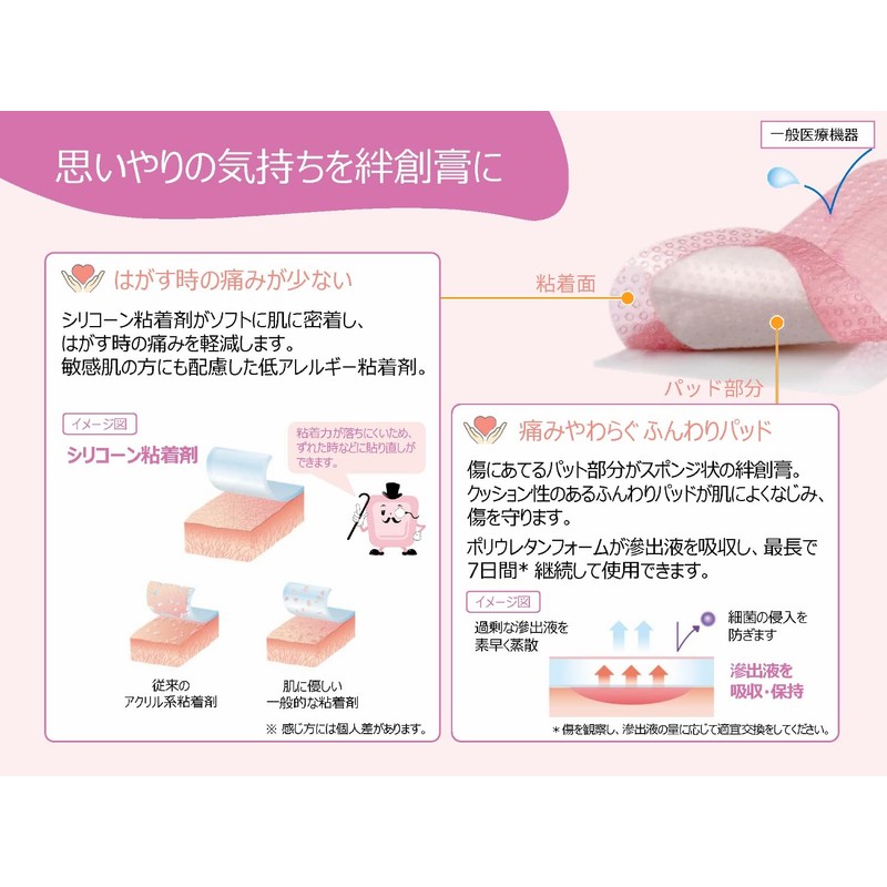 - シリコーンゲル粘着剤は、はがす時の痛みが少なく、粘着力が落ちにくいため貼り直しができます。すり傷、靴ずれや、傷ができそうな皮膚の保護にも。