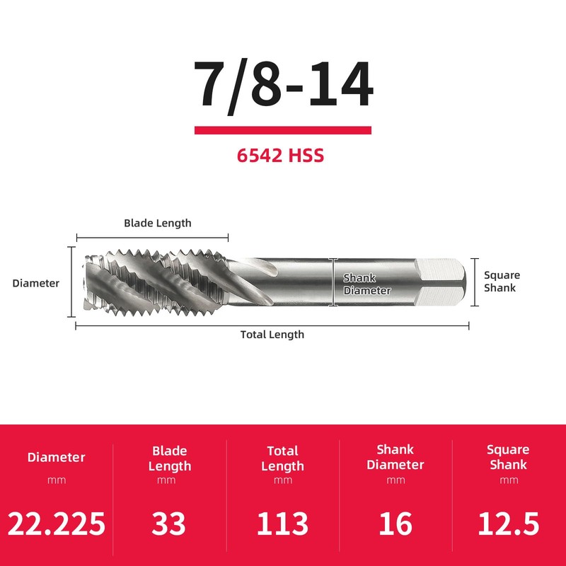 - Spiral Fluted Tap:Thread Size:7/8-14(right hand),Thread Length:33mm/1.30 ‘;Overall Length:113mm/4.45 ’;Square Shank Width:12.5mm/0.49 ’