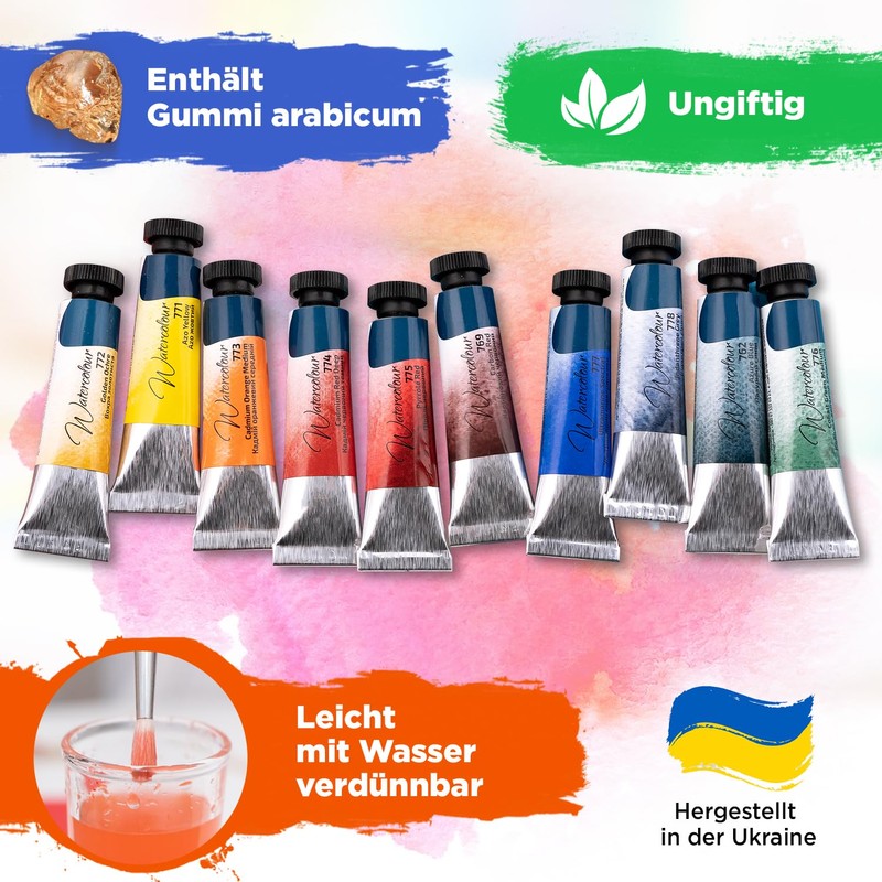 By mixing the watercolours, you can easily get the desired new colours and shades. High-quality pigments ensure saturation, purity and transparency of the colours. As a binder, which allows excellent application of the paint to the surface (e.g. canvas).