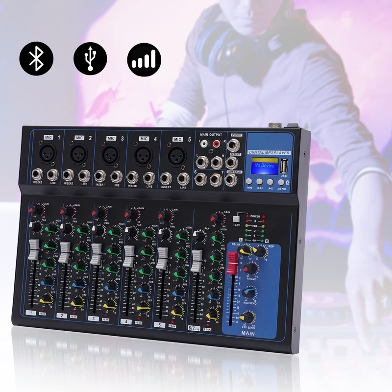 7 Channel Professional DJ Audio Mixer Sound Board Console Interface Digital USB MP3 Bluetooth Input 48V Phantom Power Stereo DJ Studio Streaming for Recording, Podcasting