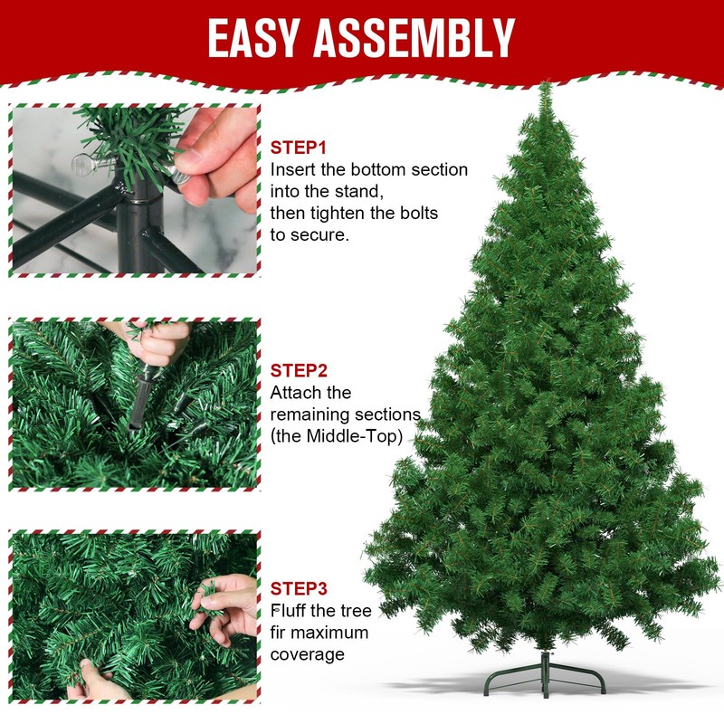 - EASY ASSEMBLY: With only three steps, simply connect the base to the largest section of the tree before attaching the remaining sections and fluffing the branches and achieve the best effect.
