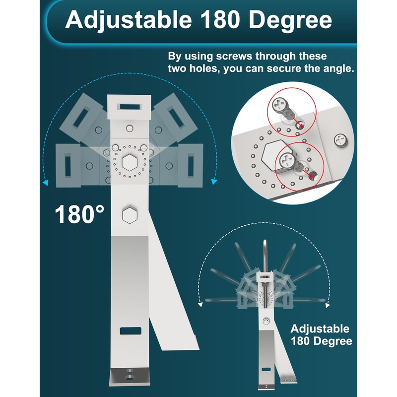 - Versatile 180-Degree Adjustable Angle: The mount allows for an adjustable angle of up to 180 degrees at the top, offering flexible installation possibilities and enabling you to customize the direction and angle of your antenna or devices. This feature is particularly beneficial for securing long rod devices to a wall, such as the Starlink dish and TV antennas, as it provides two pivot points to help withstand strong winds.