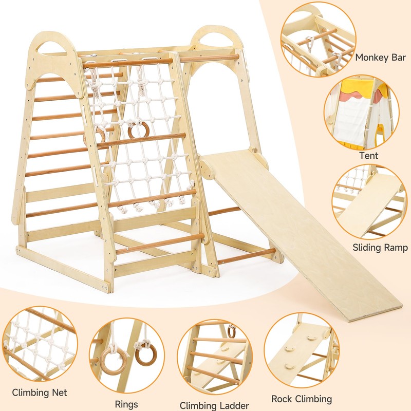 - 【Versatile Jungle Gym】Our 7-in-1 children's climbing frame is an indoor playground tailored for kids aged 3 to 6. It combines seven exciting activities—horizontal bars, tents, slides, climbing ramps, ladders, rings, and nets—offering a stimulating and challenging play area.