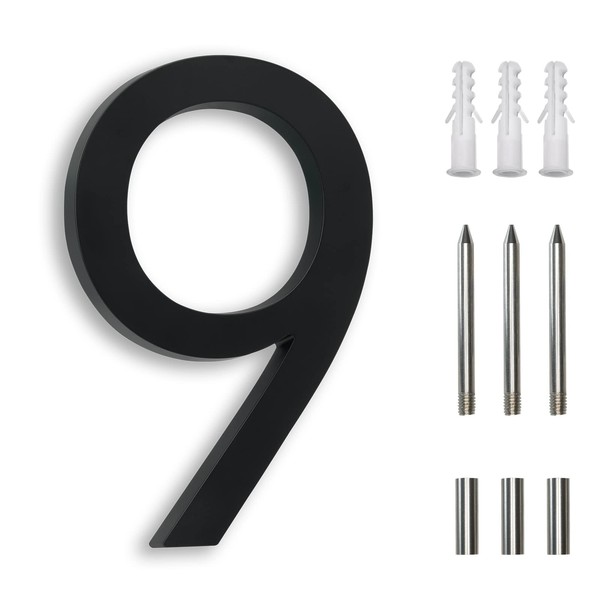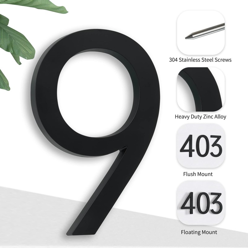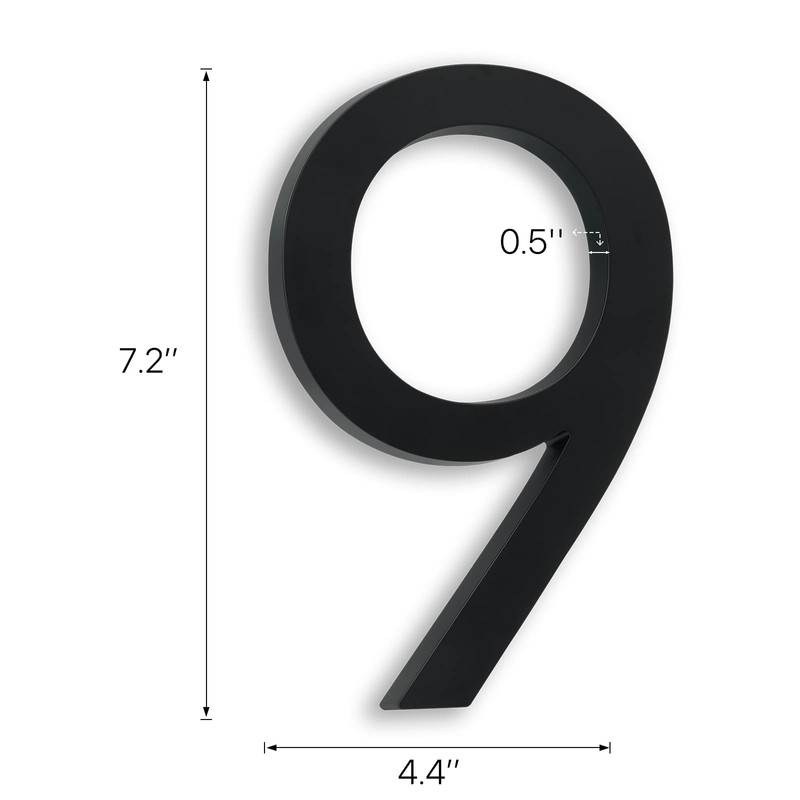 7 Inch Address Numbers for Houses, Modern House Numbers for Outside Street Metal Black Large Door Numbers on Floating Mount Zinc Alloy Black Number 9