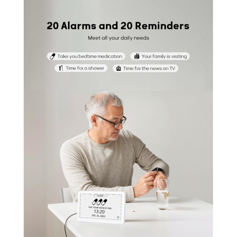 - Dementia Clock for Seniors: Our digital clock offers multiple alarms and reminders, including medication schedules, daily water intake, walking and so on, helping seniors manage their daily routines and stay on track with important activities