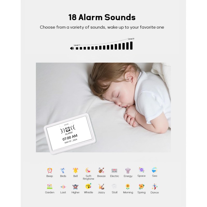 - 18 Alarm Sounds & 9-Level Volume: Choosing from 18 ringtones for personalized wake-ups or reminders. With 9 volume levels, the alarm clock is perfect for heavy or light sleepers. Set alarm durations (1, 5, or 15 minutes) and snooze times (3, 6, or 9 minutes) to suit your needs