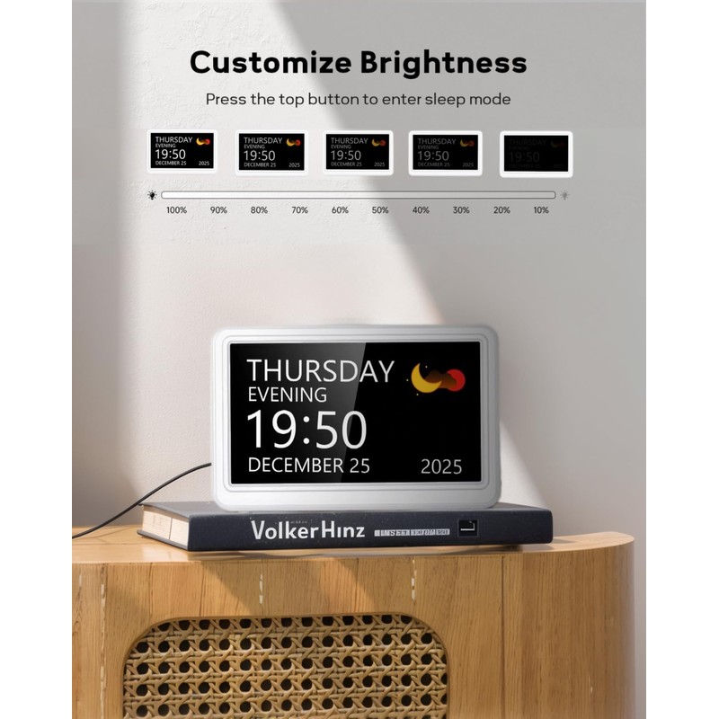- Auto Dimmer & Sleep Mode: The digital clock for seniors with 10-level dimmer (10%-100%),you can adjust brightness manually or schedule auto-changes. At night, tap the top button to turn off the screen; tap again to view the time, perfect for restful sleep and easy use